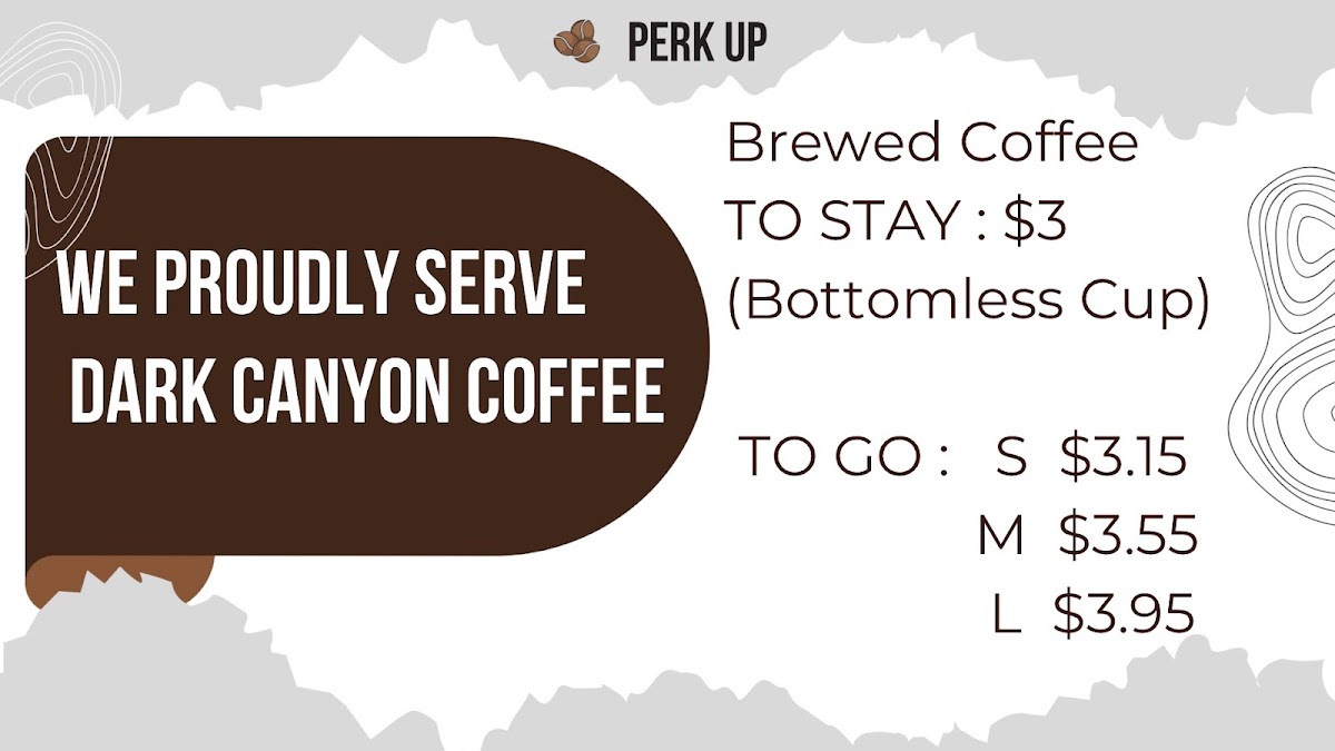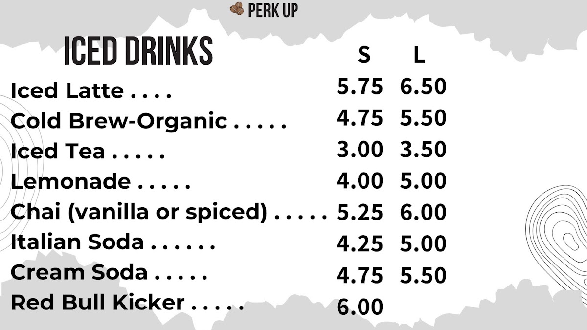 The menu at Perk Up Java Shop is structured to offer a variety of drink options alongside light food items, suitable for breakfast, coffee breaks, or casual meals. Customers can choose from a selection of blended drinks including Frozen Lemonade, Smoothies, and Frappes, providing refreshing and cold beverage options.