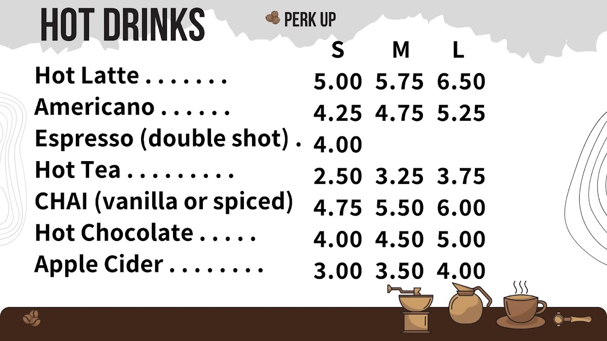 This menu setup supports quick ordering as well as casual dining experiences, making it convenient for guests to select beverages and food items according to their preferences and time of day.