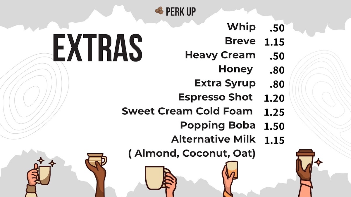 Extras are also available to customize drinks or food, such as whip, breve, heavy cream, honey, extra syrup, espresso shots, sweet cream cold foam, popping boba, and alternative milk options. These add-ons allow for personalized flavors and textures.